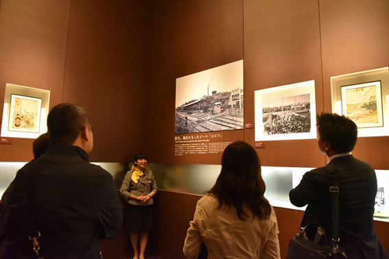 ブランドコミュニケーターさんが丁寧に、ときにはクイズを出しながらわかりやすく説明してくれます。銀座にできた日本初のビアガーデンの模型や、看板、歴代のビール瓶といったヱビスビールの歴史にまつわる品の数々が展示されており、時代の移り変わりとともに歩んだヱビスビールの歴史を知ることができます。中でも恵比寿駅の由来の話には、皆驚きの声が上がっていました。